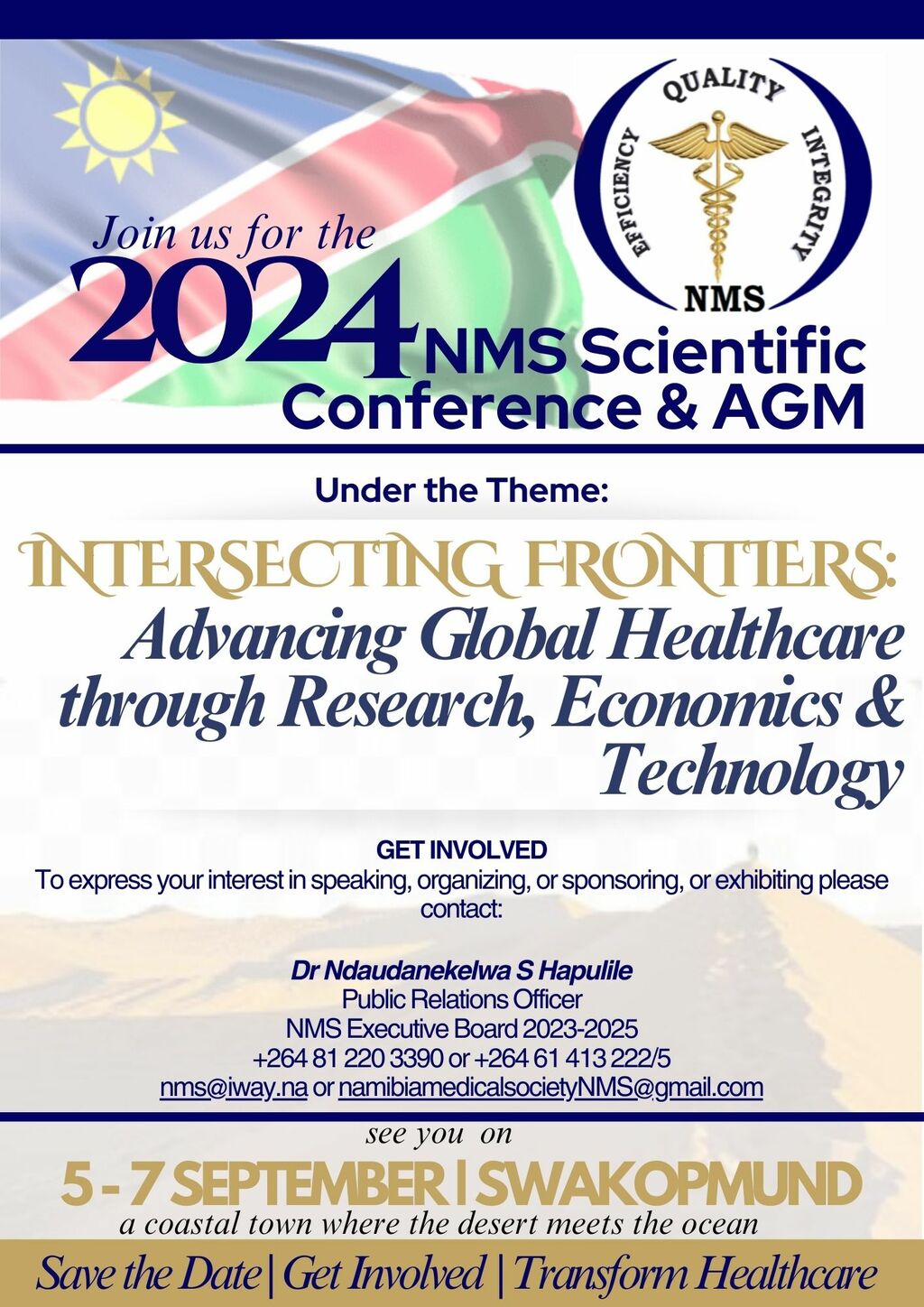 The 2024 NMS Scientific Conference in Swakopmund represents an invaluable opportunity for medical professionals, researchers, and stakeholders to come together, share knowledge, and advance the cause of healthcare in Namibia and beyond. We look forward to welcoming you to this prestigious event and to working together to promote accessible, affordable, and quality healthcare for all. This promises to be an impactful event that will not only advance the professional development of its attendees but also contribute significantly to the improvement of healthcare services in Namibia.